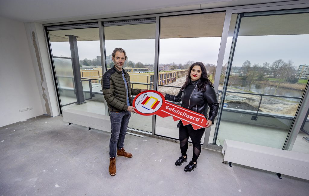 Mevrouw Ramdin kreeg bij de oplevering symbolisch en grote sleutel overhandig van Ons Huis-medewerker Sebastiaan Gerlach. “Na 16 jaar ingeschreven te hebben staan, ben ik ontzettend blij met deze woning. Het is namelijk in de buurt waar ik ben opgegroeid. Zoals het hoort bij een nieuwbouwwoning moet ik nu natuurlijk de nodige klussen doen, maar gelukkig krijg ik daar goede hulp bij.”