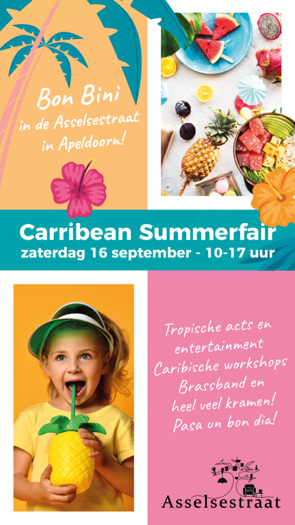 Zaterdag 16 september staat een deel van de Asselsestraat in het teken van de Caribische nazomer. Gezamenlijk organiseren de ondernemers ook dit jaar weer de populaire zomerfair. Van 10:00 – 17:00 uur is de Asselsestraat een smeltkroes van ‘tropische’ kramen, live muziek met een Caribbean-twist, foodtrucks, tropische workshops en kinderattracties.
