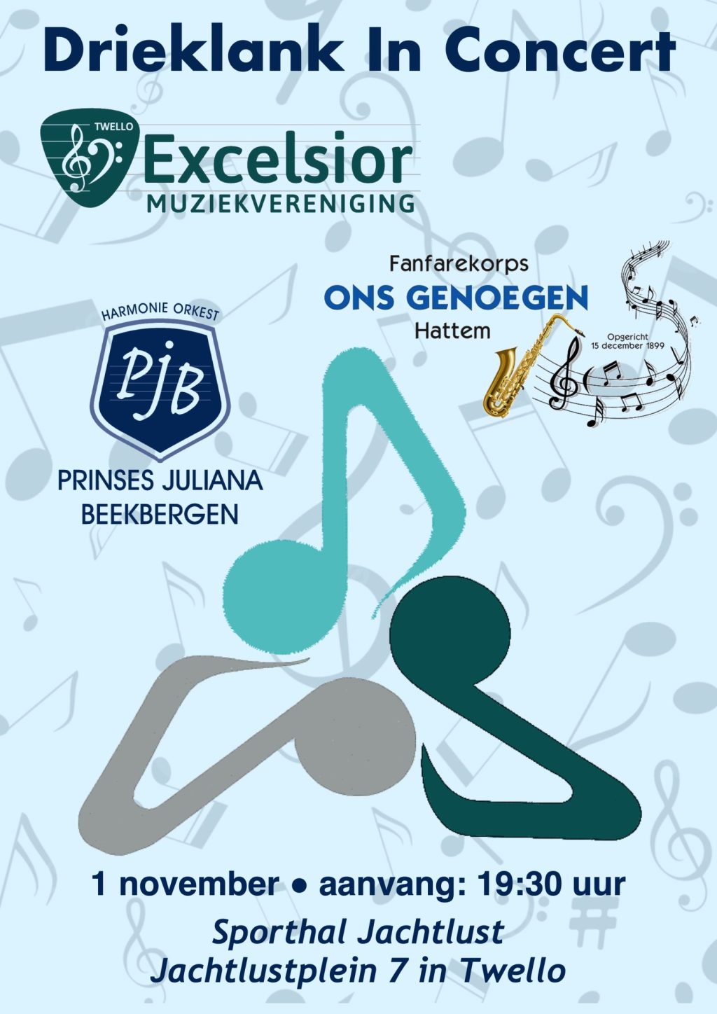 Drie muziekverenigingen uit de regio bundelen op zaterdag 1 november hun krachten tijdens een bijzonder gezamenlijk concert onder de titel Drieklank In Concert. Op het podium staan harmonieorkest Prinses Juliana Beekbergen (PJB), muziekvereniging Excelsior uit Twello en fanfarekorps Ons Genoegen uit Hattem. Het programma belooft een gevarieerde muzikale avond te worden. PJB, onder leiding van