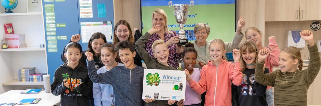 Groot feest bij PCBO De Sjofar! De school heeft dit jaar de Apentrots-wisselbokaal gewonnen. Aan het lesprogramma Apentrots deden afgelopen schooljaar bijna 800 groep-7-leerlingen mee. Tijdens het programma leren kinderen op een speelse manier wat apen ons kunnen vertellen over gezond leven. Ze volgen een gastles over voeding van het CJG en Apenheul, een beweegles