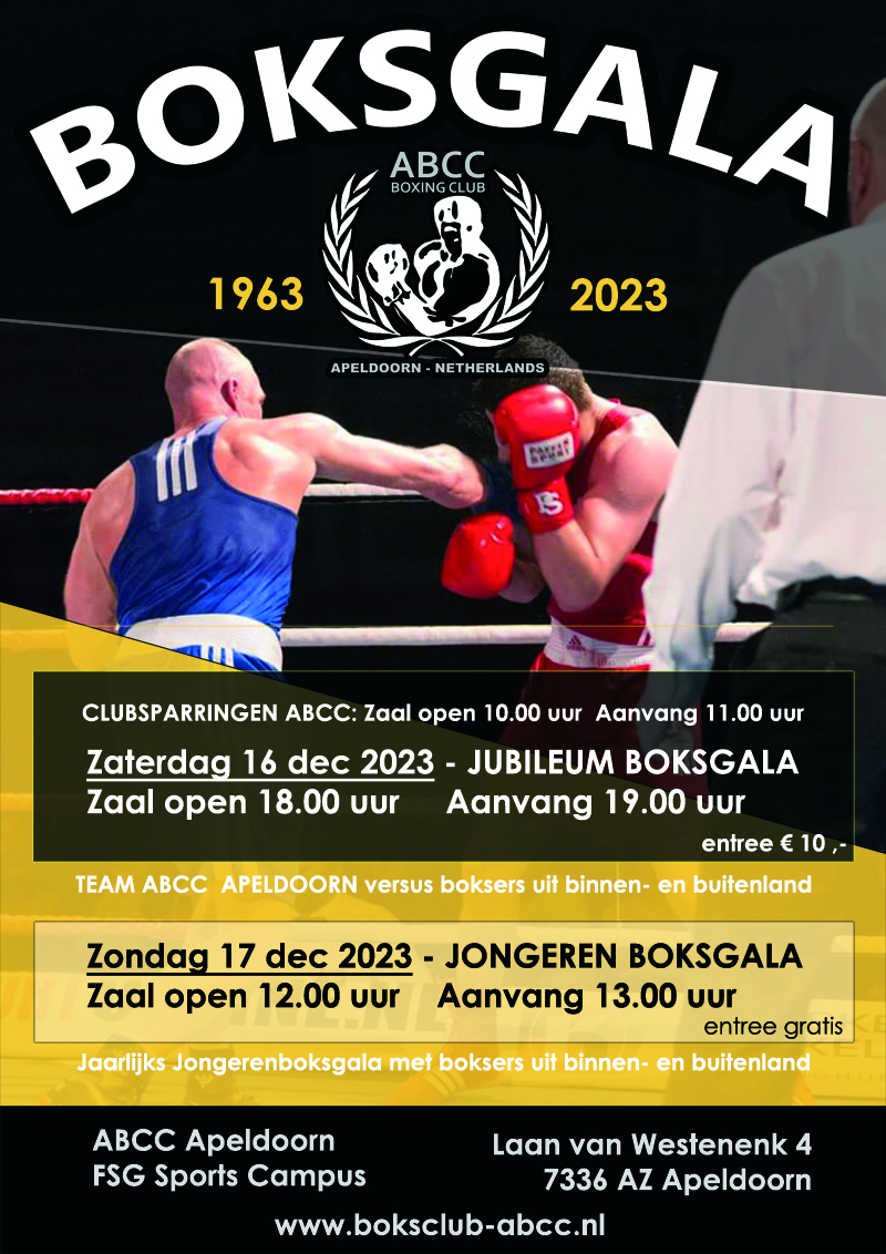 Op zaterdag 16 en zondag 17 december wordt het 60-jarig jubileum van Boksclub ABCC Apeldoorn op sportieve wijze gevierd in de bokshal. Op zaterdagavond om 19.00 uur zullen de wedstrijdboksers van ABCC Apeldoorn de strijd aangaan met sterke tegenstanders. Deze wedstrijden worden versterkt met boksers van andere clubs, wat zorgt voor een indrukwekkende boksavond. Voor