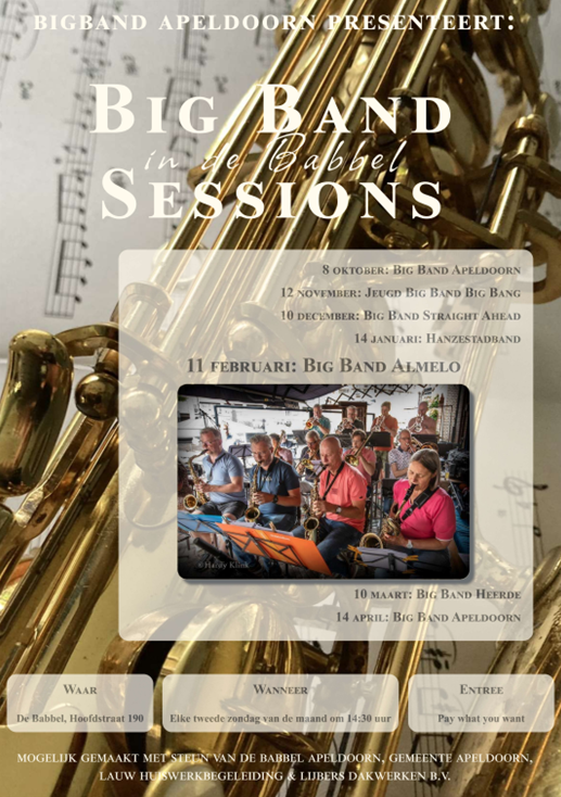 De entree voor dit evenement is gratis dankzij de sponsoring van Lauwe Huiswerkbegeleiding, Lijbers Dakwerken, de gemeente Apeldoorn en De Babbel. Er zal echter tijdens de pauze een vrijwillige bijdrage worden gevraagd ter ondersteuning van Big Band Almelo. De komende maanden zijn er optredens van Big Band Heerde. Big Band Apeldoorn sluit in April af.