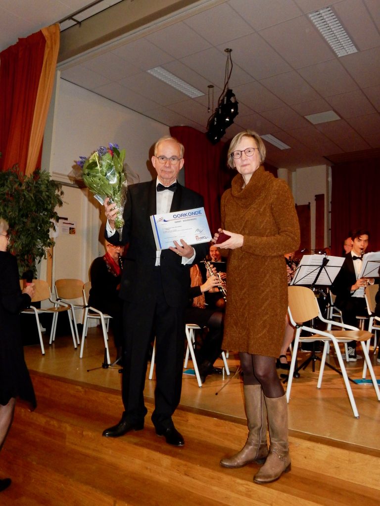 Gerrit Woudenberg werd op 5 november tijdens het Feel Good concert van harmonieorkest Prinses Juliana Beekbergen (PJB) gehuldigd voor zijn 60-jarig lidmaatschap van PJB. Orkestlid Saskia van Andel sprak de jubilaris halverwege het concert toe en spelde Gerrit, als aandenken en blijk van waardering, een vergulde speld met twee zirkonia’s op.