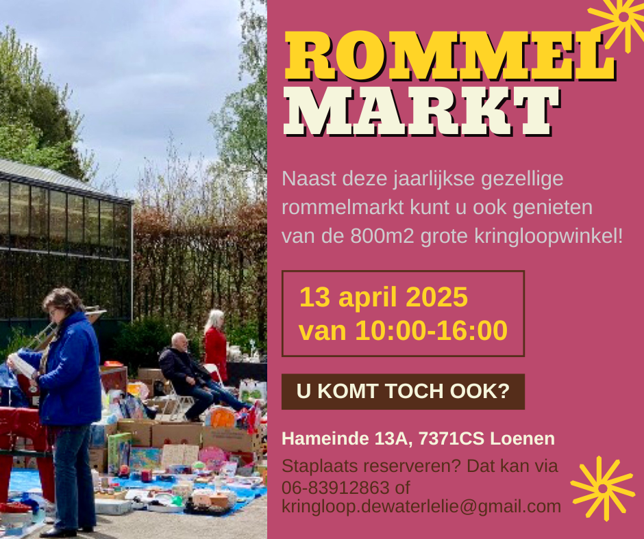 Zin in een gezellige dag snuffelen tussen tweedehands schatten? Kom dan op zaterdag 13 april naar de eerste rommelmarkt van het jaar bij Kringloop de Waterlelie! De markt vindt plaats op de parkeerplaats aan het Hameinde 13A in Loenen en is geopend van 10.00 tot 16.00 uur. De toegang is gratis.