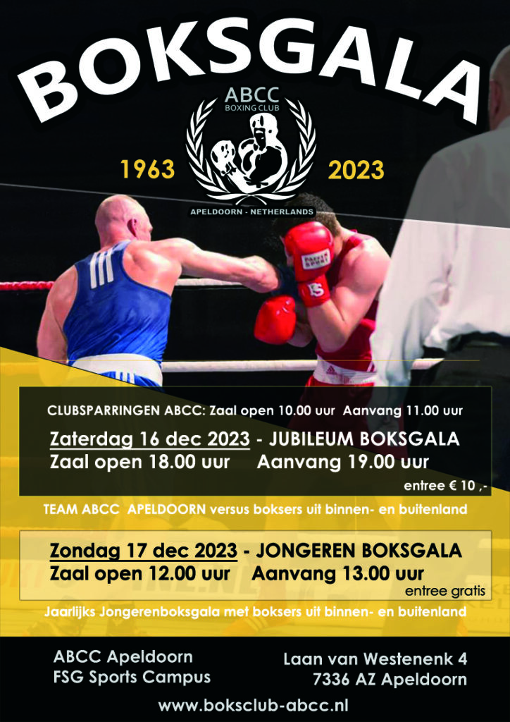 Op zaterdag 16 en zondag 17 december wordt het 60-jarig jubileum van Boksclub ABCC Apeldoorn op sportieve wijze gevierd in de bokshal.