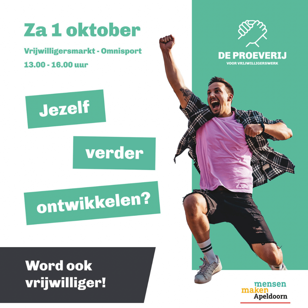Op zaterdag 1 oktober wordt voor de 4e keer de Proeverij voor Vrijwilligerswerk in Apeldoorn georganiseerd. Belangstellenden kunnen die middag van 13.00 tot 16.00 uur in Omnisport komen ‘proeven’ op hoeveel verschillende manieren je actief kunt zijn als vrijwilliger. Je ziet en ervaart hoe divers, breed, leuk, zinvol en leerzaam vrijwilligerswerk is en kan zijn. Ruim 60 organisaties presenteren zich aan het publiek en laten zien wat je als vrijwilliger bij hen kan doen.