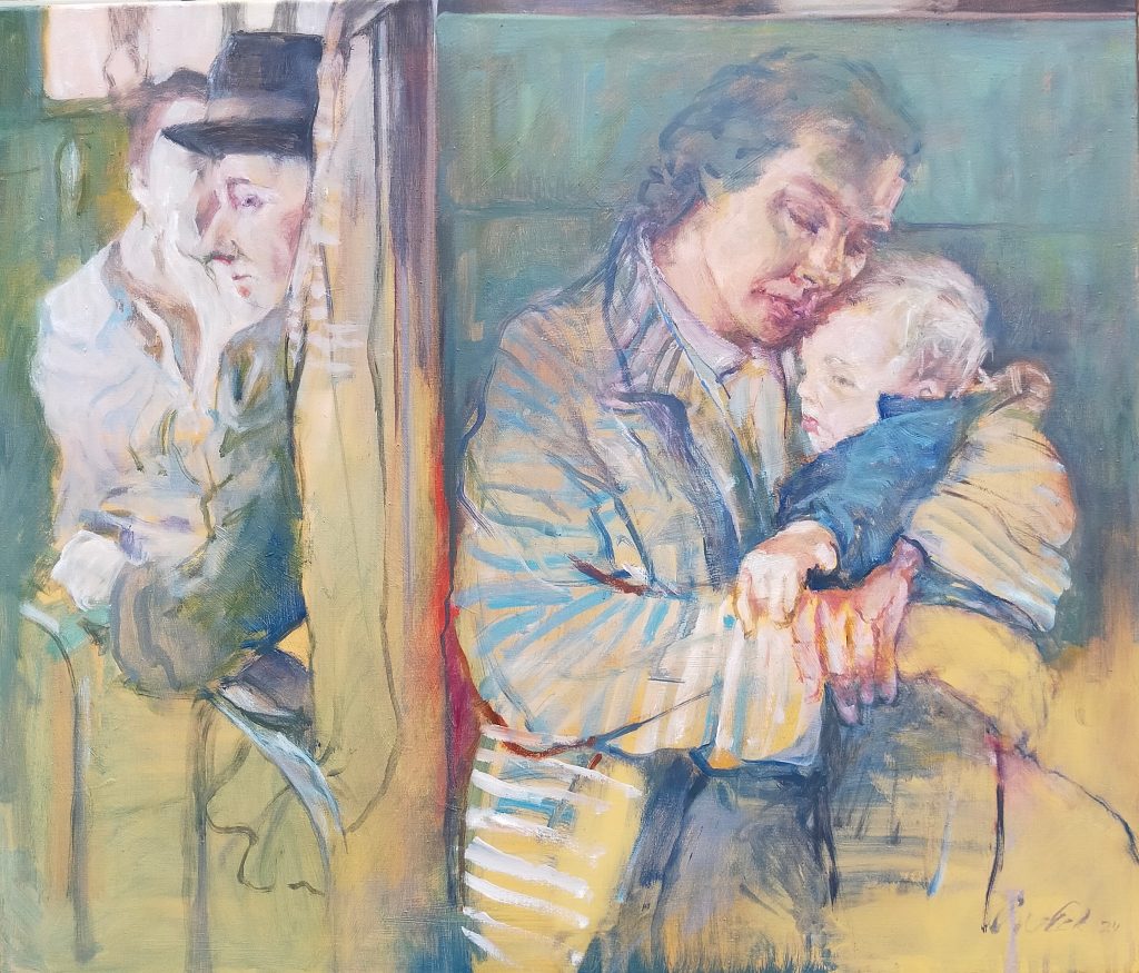 Rob van Eek vangt een tijdloos thema in olieverf op doek, waarbij hij de jaren 50 als decor en kledingstijl inzet om de emotionele lading te versterken. De schetsmatige opzet richt de aandacht op het moment zelf en benadrukt de tijdloze, universele kracht van liefde.