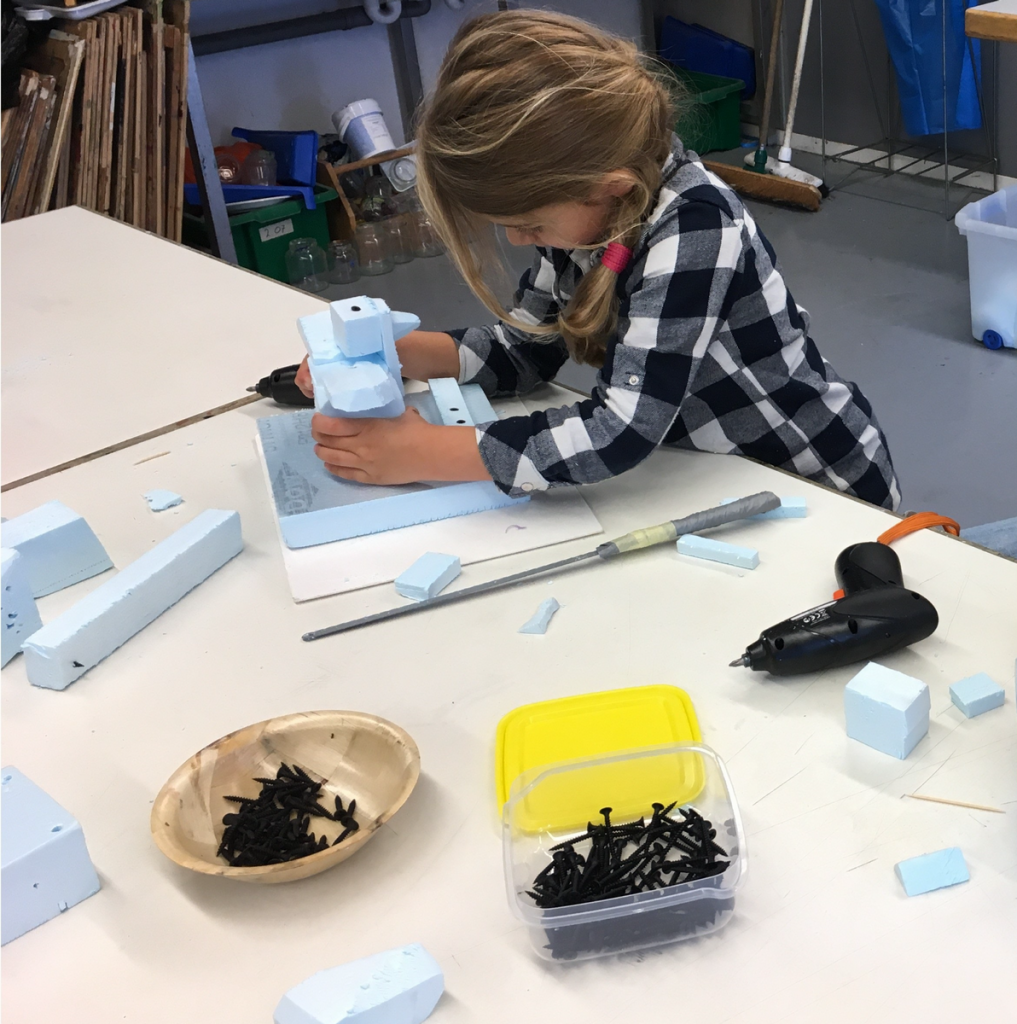 Deelnemers werken met materialen zoals hout, verf, karton, tape en schroeven, en gereedschappen aan wat ze maar willen: een vliegend paard, een ruimtestation, of iets dat kan rijden?