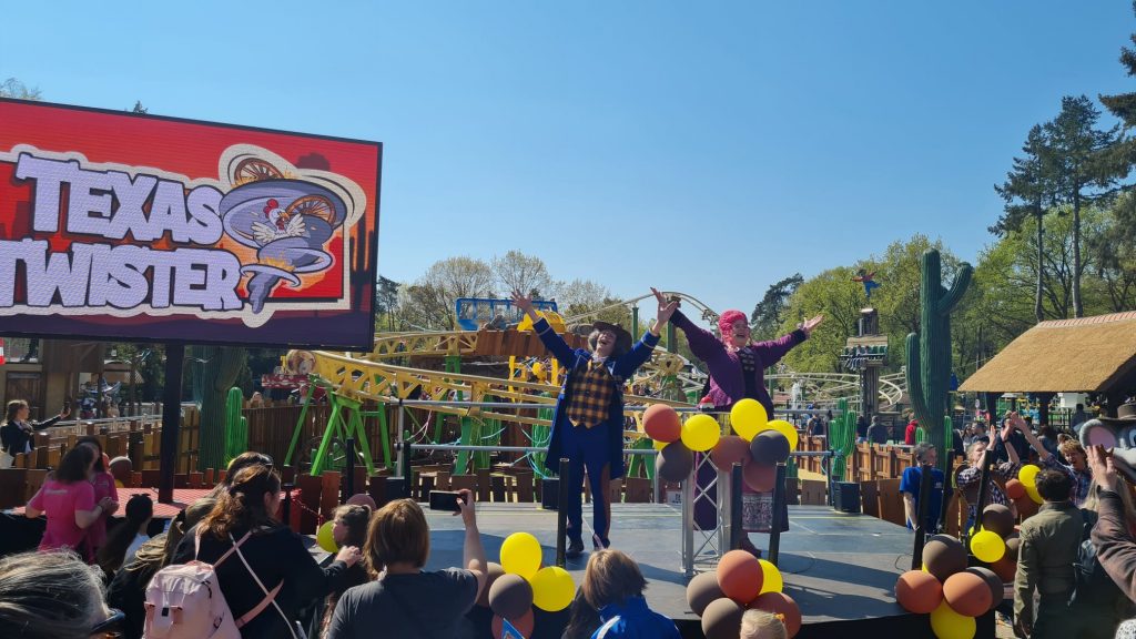 Wel helemaal onder de confetti, de wind was goed gezind en blies dit allemaal richting de Texas Twister. Deze relatief kleine achtbaan in de vorm van een acht heeft toch best wat pit. Als je de spinning coaster ziet verwacht je niet direct dat deze baan toch voor een echt achtbaan gevoel kan zorgen. Dit komt mede door het ronddraaien van de bakjes waar je in zit ten opzichte van het onderstel.