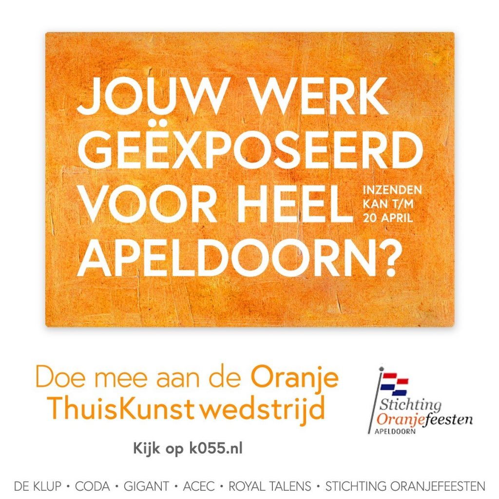 Stichting Oranjefeesten organiseert samen met CODA, ACEC, Gigant, Royal Talens en de Klup Apeldoorn de ‘Oranje ThuisKunstwedstrijd’, nu ze zelf alle gebruikelijke activiteiten op Koningsdag heeft moeten staken. Anders vieren De landelijke overheid heeft de al lopende maatregelen verlengd om het Coronavirus onder controle te krijgen. Alle bijeenkomsten en evenementen zijn tot 6 mei 2021