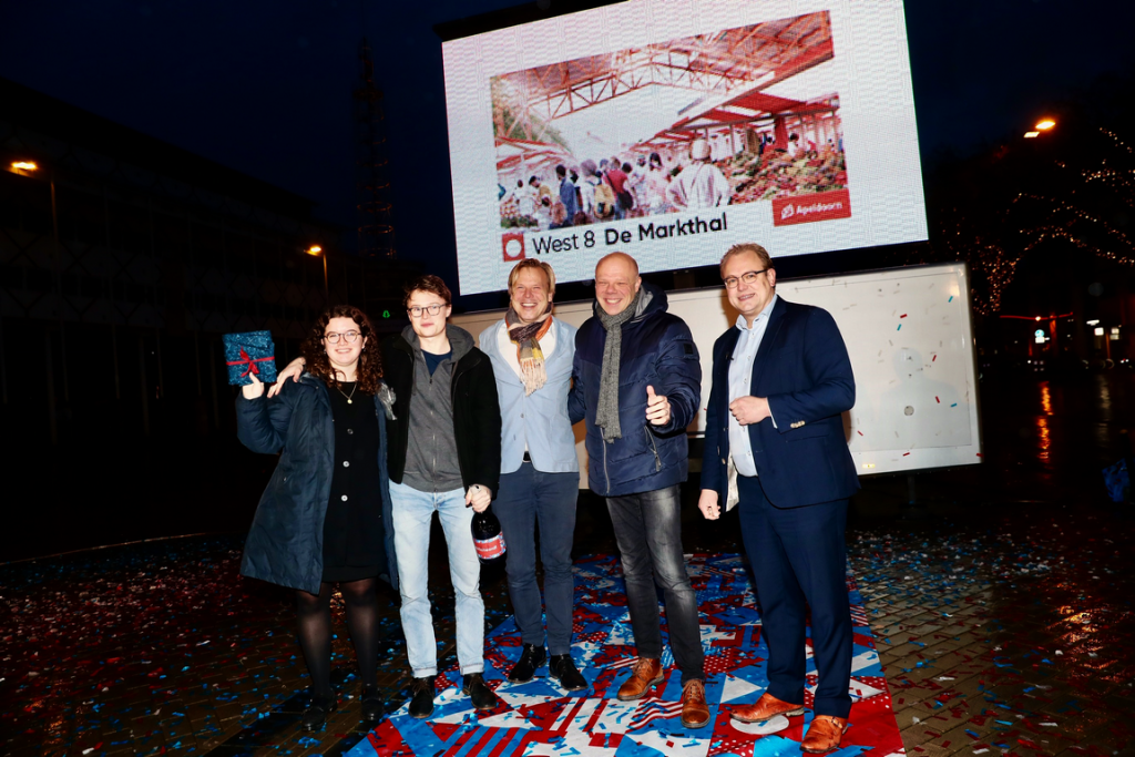 Het ontwerp voor het nieuwe Marktplein is bekend. ‘De Markthal’ siert vanaf 2021 het toekomstige Plein van de Stad. Het ontwerp komt van het Rotterdamse bureau West 8. De afgelopen dagen brachten 25.330 Apeldoorners hun stem uit op hun favoriete ontwerp. Wethouder Mark Sandmann maakte de winnaar bekend door midden op het Marktplein een druk