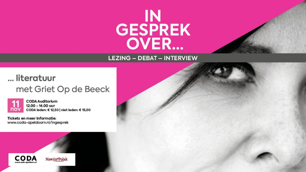 Zondag 11 november komt Griet Op de Beeck (Vele hemels boven de zevende, Kom hier dat ik u kus en Gij nu) naar CODA waar ze bezoekers aan de hand van fragmenten meeneemt in haar manier van werken en schrijven. Deze middag maakt deel uit van de serie ‘In gesprek over…’ die deze keer in