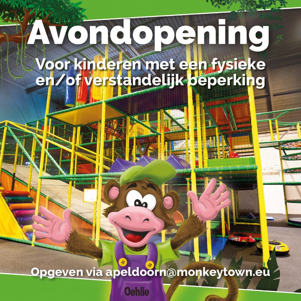 Monkey Town Apeldoorn organiseert op dinsdag 26 oktober 2021 van 18.00 tot 20.00 uur een avondopenstelling voor kinderen met welke fysieke of verstandelijke beperking of stoornis dan ook. Tijdens deze uren laat zij slechts een handjevol gezinnen binnen, zodat er extra veel ruimte is en vermindert zij het geluidsniveau door muziek uit te zetten. Wie