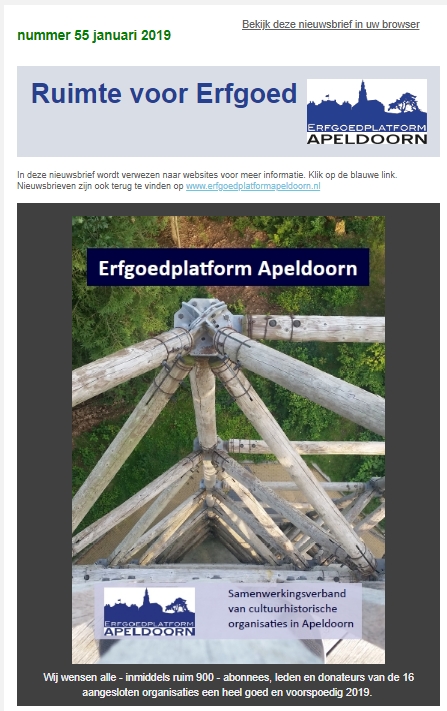 Via de maandelijkse digitale nieuwsbrief ‘Ruimte voor Erfgoed’ worden abonnees op de hoogte gehouden van activiteiten en nieuws over het Apeldoornse erfgoed. Een jaar geleden nam de Stichting Erfgoed Platform Apeldoorn (EPA) de digitale nieuwsbrief over van de afdeling cultuur van de gemeente Apeldoorn, er waren destijds 420 abonnees. Tijdens de diverse activiteiten van de