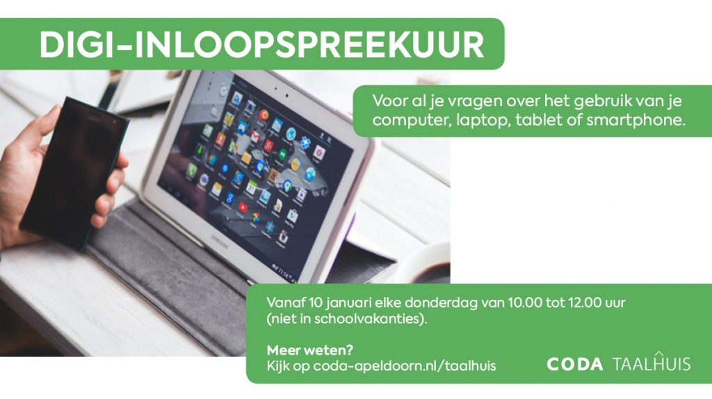 Het digi-inloopspreekuur wordt elke donderdag gehouden, behalve in de schoolvakanties. De toegang is gratis en aanmelden is niet nodig. Voor eventuele vragen kun je ons ook mailen: taalhuis@coda-apeldoorn.nl.